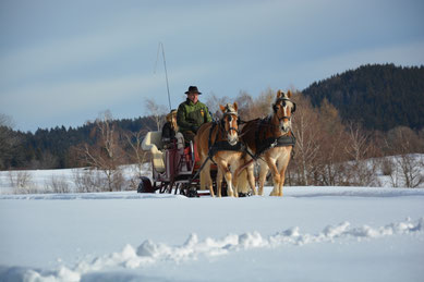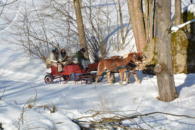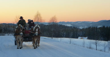 Mit Freunden oder Familie eine Pferdeschlittenfahrt mit Einkehr auf Bauernkrapfen und Kaffee genießen.